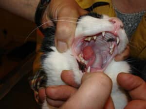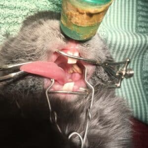 Lapin qui a des difficultés pour se nourrir. Un examen de la cavité buccale avec un otoscope à permis de déceler des molaires beaucoup trop longues. Il a été anesthésié et ses dents ont été raccourcies