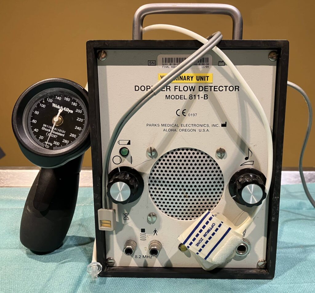 On place un brassard relié au manomètre au niveau de la patte avant,