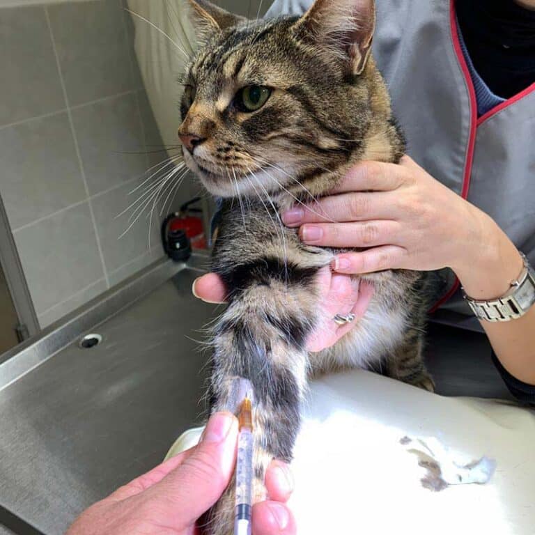Le chat est emballé dans un drap , la patte est rasée et il n’ y a plus qu’a tenir le chat, sa patte ,sa tête et ponctionner la veine.