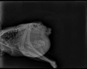 Radiographie d'une poule, il y a une masse importante dans le bas de l'abdomen, les petits points blancs sont des graviers dans son gésier