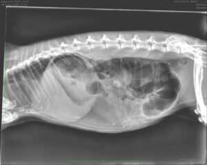 Radiographie 1 semaine avant l'accouchement, permet de compter le nombre de chiots, on compte les têtes ou les colonnes, dans ce cas 3 chiots